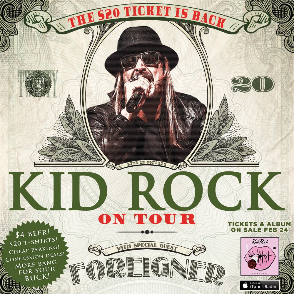 TICKETS ON SALE TODAY AT 10AM LOCAL TIME! The $20 ticket is back! KID ROCK PRESENTS: First Kiss: Cheap Date Tour! See all the stops, get show details and buy tickets here starting at 10AM local time.FIRST KISS AVAILABLE NOW! The new album featuring “First Kiss,” “Jesus and Bocephus,” “Ain’t Enough Whiskey,” and "Johnny Cash" is out now! Pick up First Kiss in stores or order it...