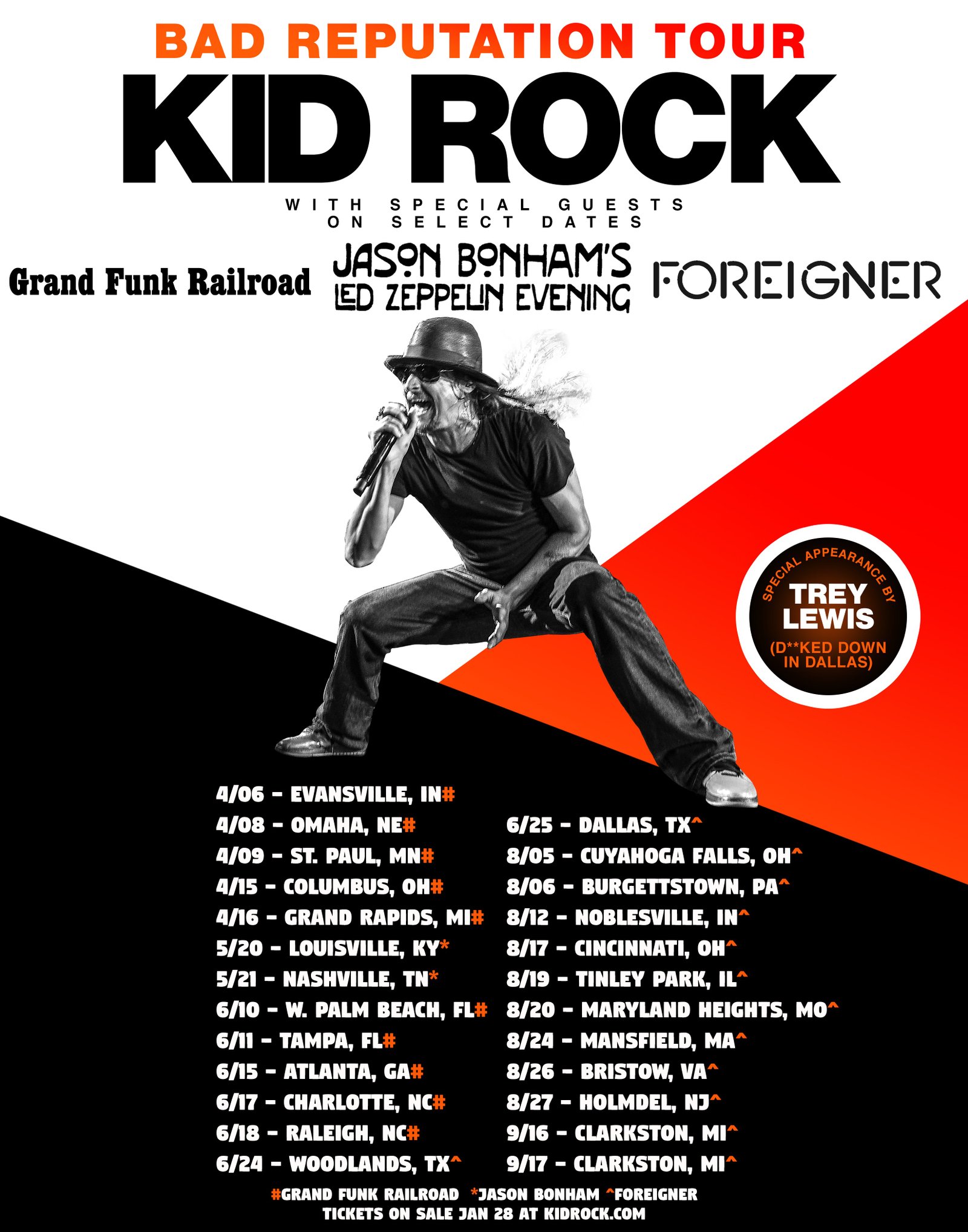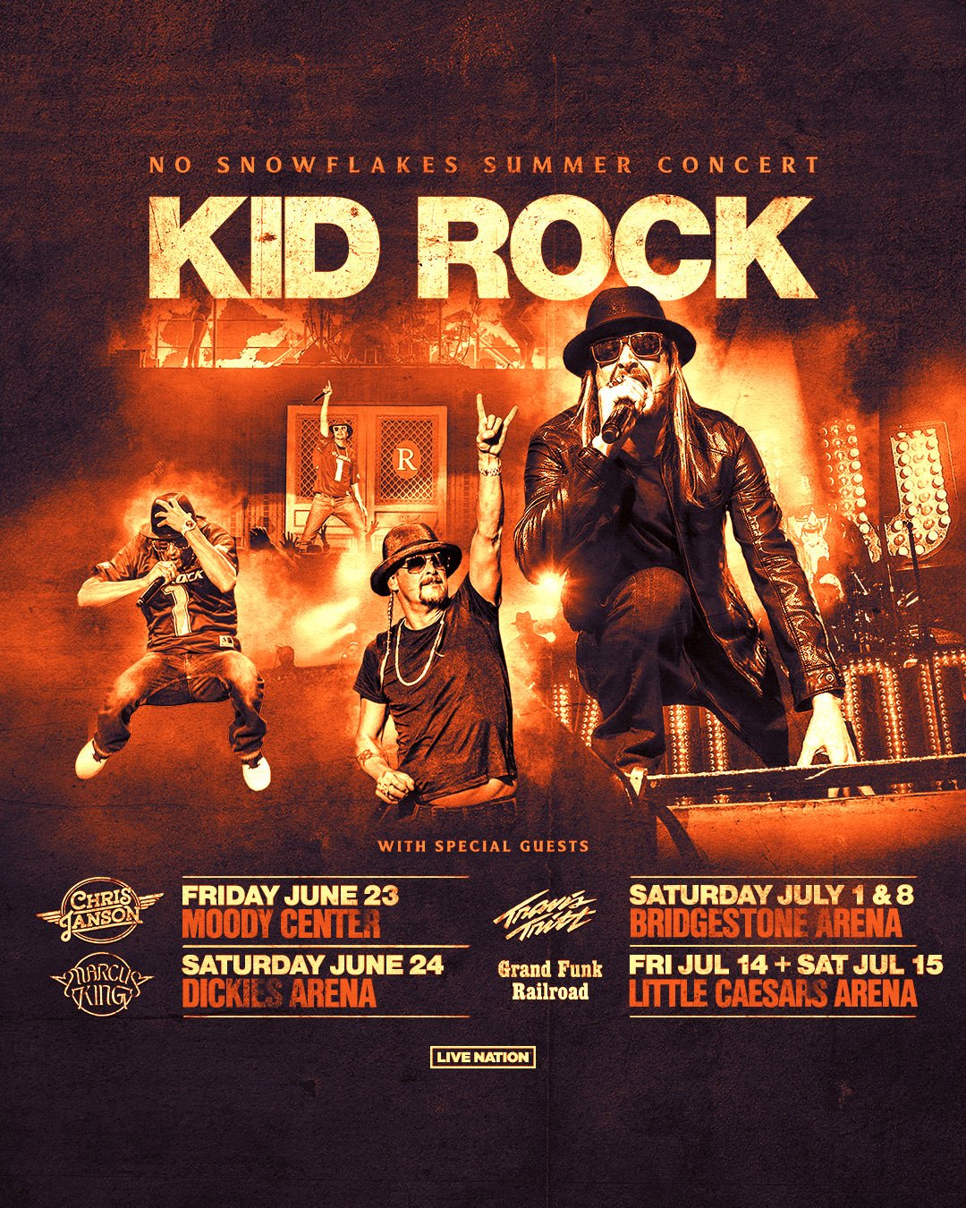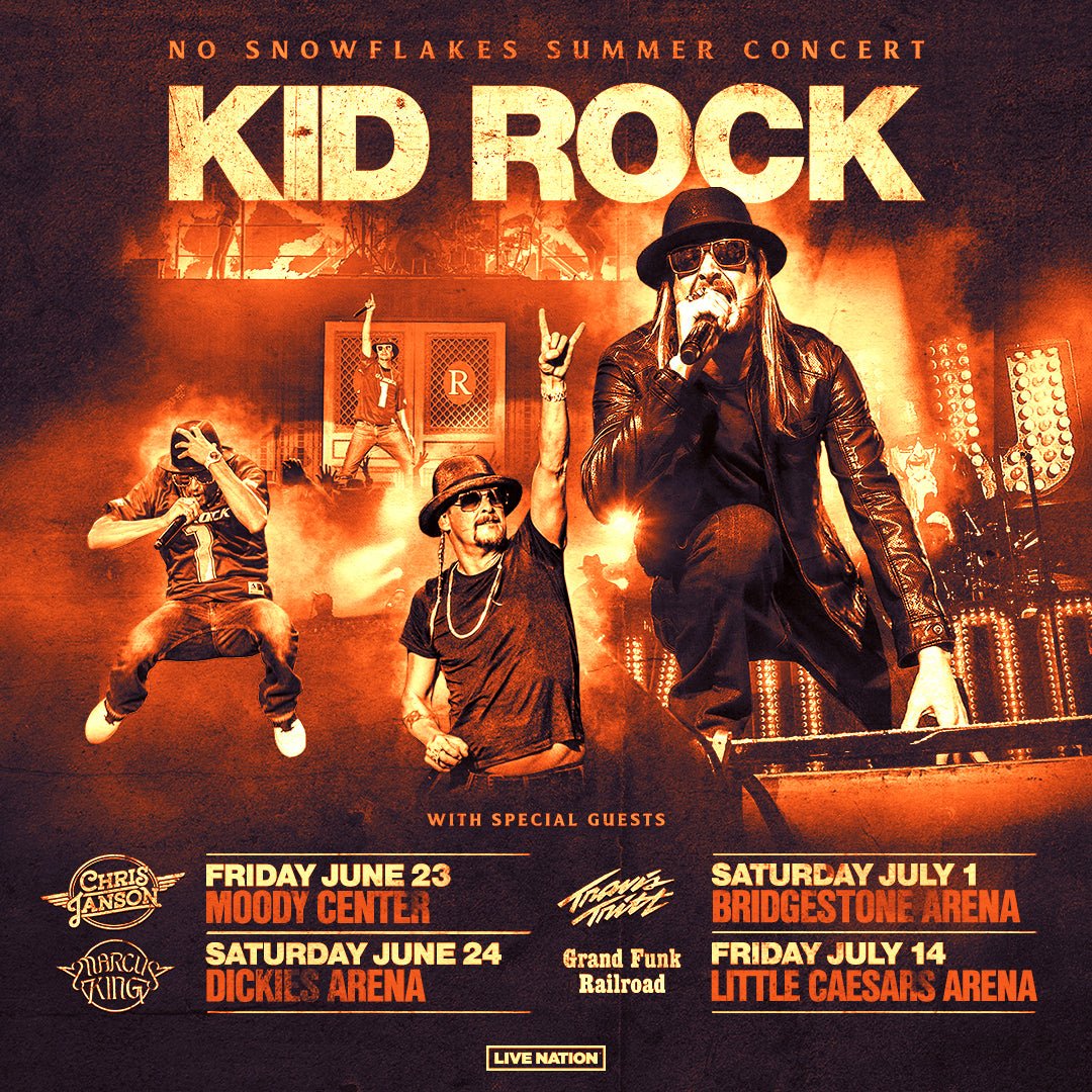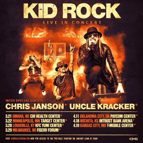 Kid Rock is back on the road with 7 stops in some of his favorite American cities this spring! Special guests Chris Janson (March shows) and Uncle Kracker (April shows) will be joining Kid Rock on this run too. Catch the show live on: