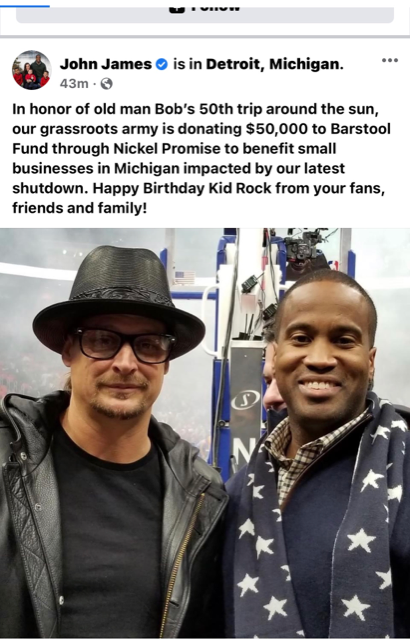 "In honor of old man Bob's 50th trip around the sun, our grassroots army is donating $50,000 to Barstool Fund through Nickel Promise to benefit small businesses in Michigan impacted by the latest shutdown. Happy Birthday Kid Rock from your fans, friends and family!"