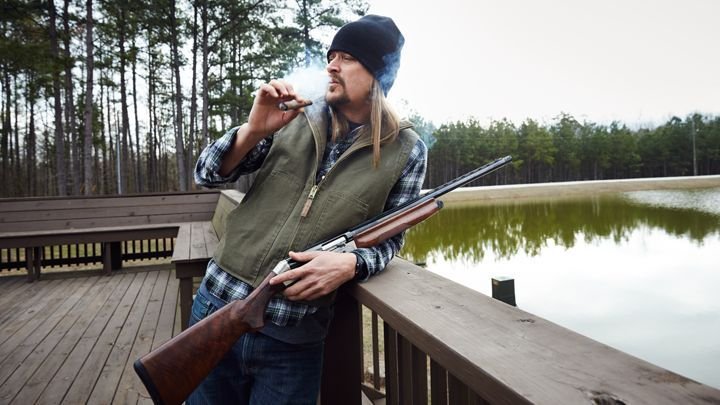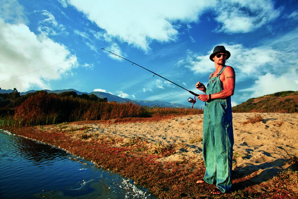 Ten miles outside town on a two-lane county road, just past the trailer park and across the street from Hank Williams Jr.'s place, there's a driveway with a poster that says "Re-Elect Sheriff Russell Thomas." Beyond a gate, a dirt road winds around a small lake, past a "Don't Feed the Hippies" sign, leading to a brown double-wide trailer (WiFi password: Troublewide). Kid Rock stands...