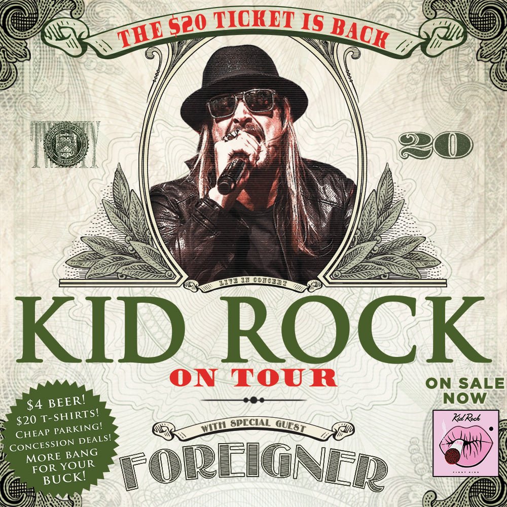 TICKETS ON SALE TODAY AT 10AM LOCAL TIME! The $20 ticket is back! KID ROCK PRESENTS: First Kiss: Cheap Date Tour! See all the stops, get show details and buy tickets here starting at 10AM local time.FIRST KISS AVAILABLE NOW! The new album featuring “First Kiss,” “Jesus and Bocephus,” “Ain’t Enough Whiskey,” and "Johnny Cash" is out now! Pick up First Kiss in stores or order it...